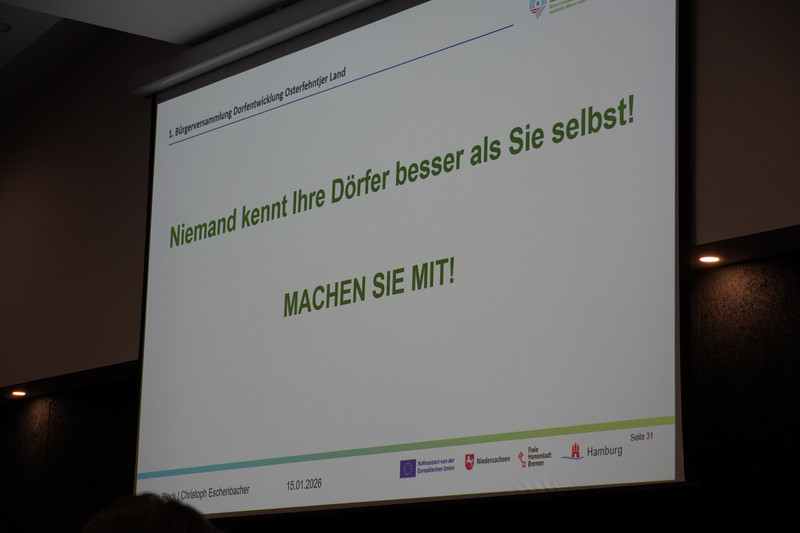 Bei der Bürgerversammlung stellten die Planungsfirma Pro-t-in GmbH sowie das Amt für regionale Landesentwicklung Weser-Ems die Ziele, Chancen und den Ablauf des Dorfentwicklungsprozesses vor. Die Teilnehmenden erhielten einen umfassenden Einblick in die kommenden Schritte und die vielfältigen Möglichkeiten, sich einzubringen.