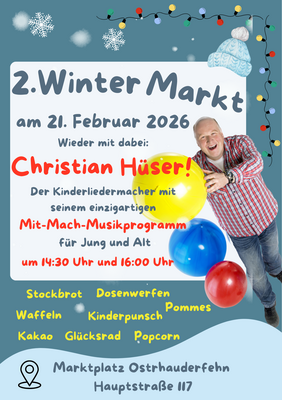 Am 21. Februar 2026 findet in der Zeit von 14:00 bis 23:00 Uhr auf dem Marktplatz am Rathaus der 2. Wintermarkt in der Gemeinde Ostrhauderfehn statt.