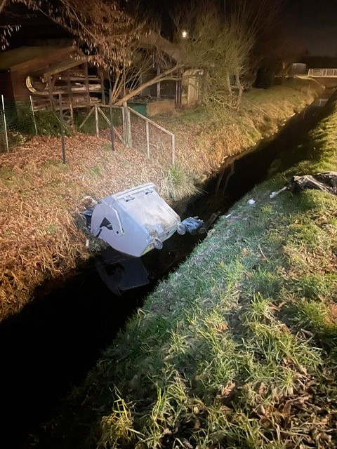 - Ein Abfallcontainer wurde in einen angrenzenden Graben geworfen und musste durch den Bauhof mit Hilfe eines Krans geborgen werden